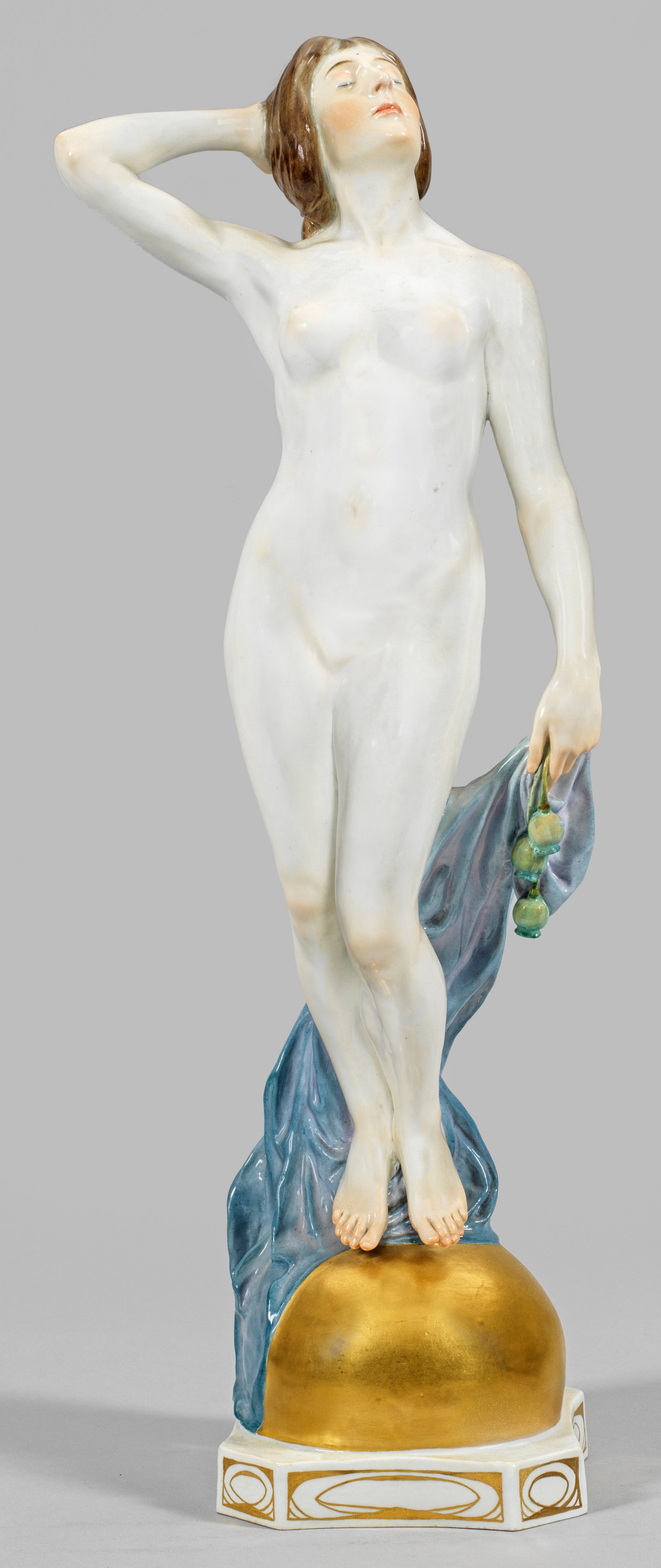 Quadratische, eingezogene Plinthe mit abgeschrägten Ecken, umlaufender Golddekor. Über einer vergoldeten Halbkugel schwebend dargestellter, weiblicher Akt mit erhobenem Kopf und verschlossenen Augen. Das kastanienbraune Haar ist im Nacken locker zu einem Knoten gebunden. Die rechte Hand liegt auf dem Hinterkopf, in der Linken trägt sie ein fliederfarbenes Tuch. Pastelltonige, polychrome Malerei. Entw. Arthur Lange, 1901. Modell-Nr. T 158. Schwertermarke. H. 44 cm.