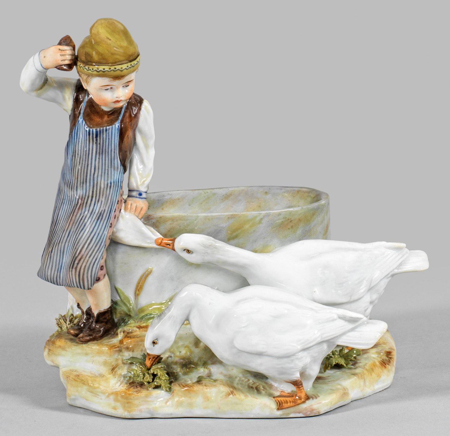 Auf naturalistischem Sockel, gelehnt an einem Wassertrog stehender Knabe in bäuerlicher Kleidung mit zwei Gänsen. Polychrome Malerei. Entw. Adolf Rehm, 1898. Modell-Nr. R 147. Minim. rest.; Schwertermarke. H. 14 cm.
