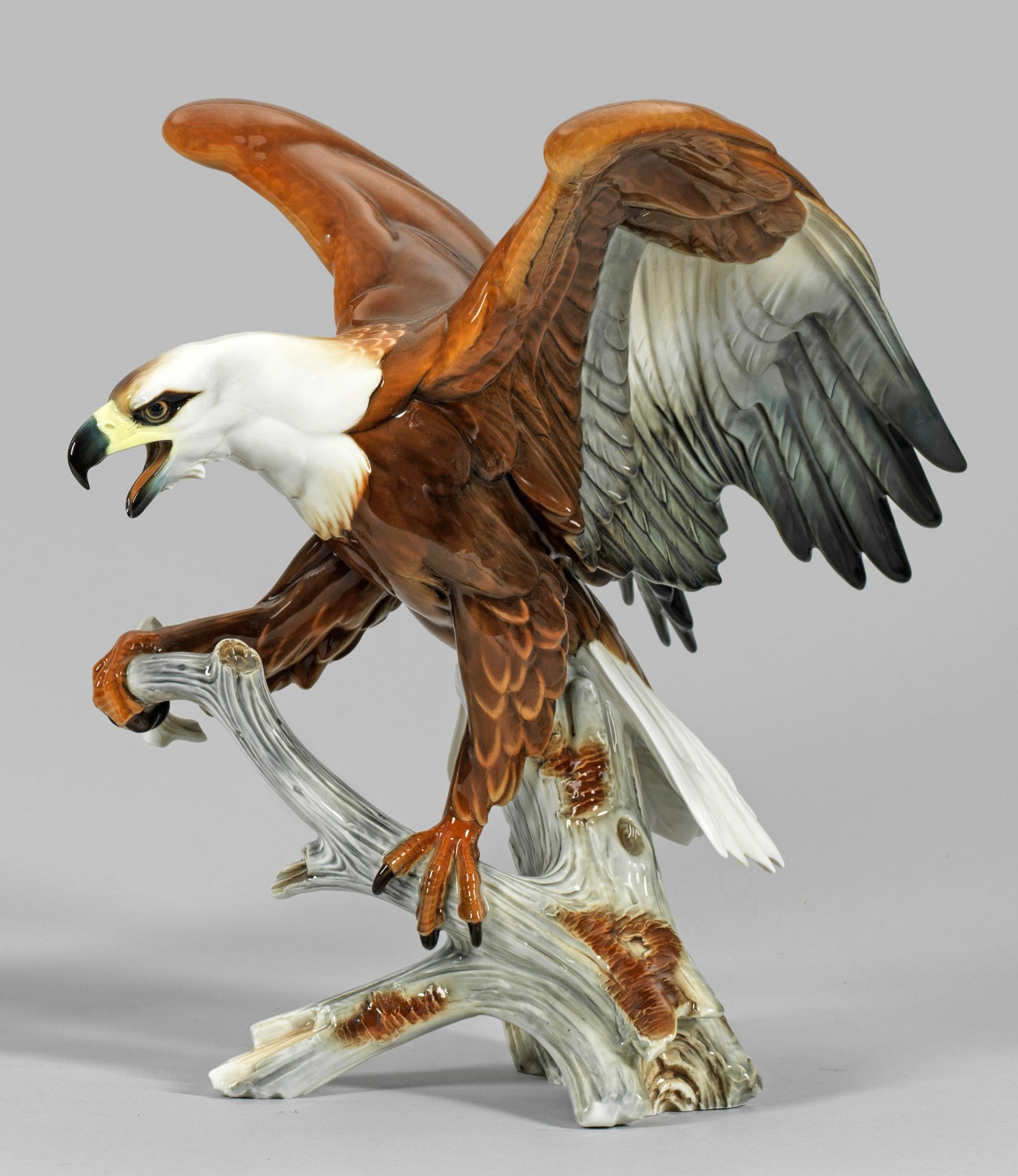 Auf vollplastisch gearbeitetem Astsockel sitzender Greifvogel in beobachtender Stellung mit leicht geöffneten Flügeln. Polychrome, naturalistische Unterglasurmalerei. Entw. Gunther Granget. Entw.-Bez.; Unw. rest.; Manufakturmarke. H. 42 cm.
