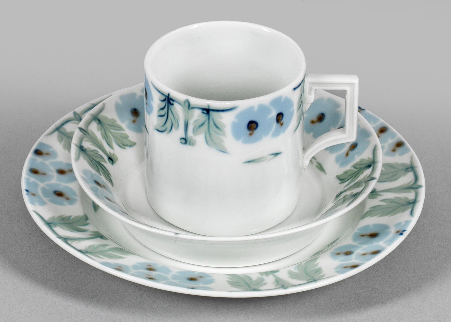 3-tlg.; Tasse mit Untertasse und Kuchenteller. Klassizistische Tassenform mit profiliertem, gekantetem Henkel. Stilisierter Primelmusterdekor aus Blüten und Blättern im Rapport. Polychrome, pastelltonige Unterglasurmalerei in hellem Blau- und Grünton mit wenig Braun. Dekor-Entw. Arthur Barth, 1906. Schwertermarke. Tassen-H. 6,5 cm. Teller-D. 17 cm.
