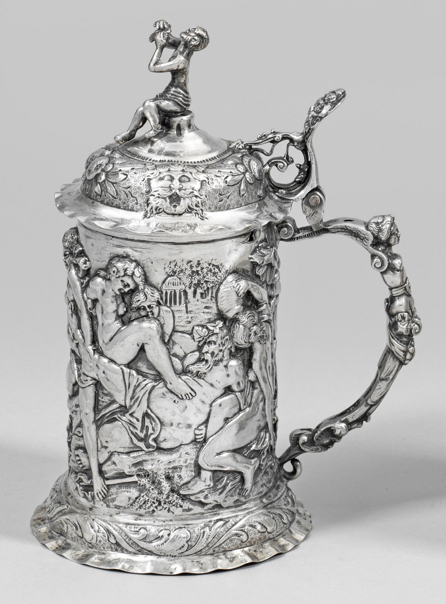 Silber. Gewölbter Stand mit ausgestelltem, gewelltem Standring und umlaufendem Band aus reliefiertem Blattwerk. Zylindrischer Korpus mit üppig reliefplastisch ausgearbeiteter, mythologischer Darstellung eines trunkenen Bacchantenzuges mit Esel vor architektonischer und bewaldeter Landschaft. Auf halbkugeligem Scharnierdeckel, umzogen von Maskaronen und Fruchtbündeln und wellenförmigem Rand, ein vollplastisch gearbeiteter, sitzender und Panflöte spielender Faun als Knauf. Die Daumenrast mit Maskaron und durchbrochen gearbeiteten Voluten verziert. C-förmig geschwungener Henkel mit reliefplastisch ausgearbeiteter Herme. Innen vergoldet. Gest., Herstellerzeichen und Pseudomarken. Gew. ca. 540 g. H. 21 cm.