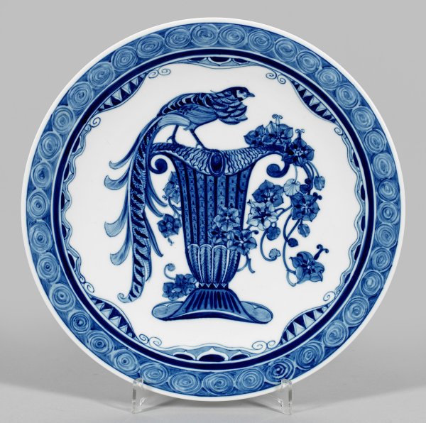 Runde, flach gemuldete Form mit glattem Rand. Im Spiegel stilisierte Darstellung eines exotischen Vogels, auf dem Mündungsrand einer Vase sitzend. Umlaufend verschiedene Ornamentbänder. Dekor-Entw. wohl Otto Eduard Voigt. Unterglasurblaue, mehrfarbig abgestufte Malerei. Schwertermarke. D. 35 cm.
