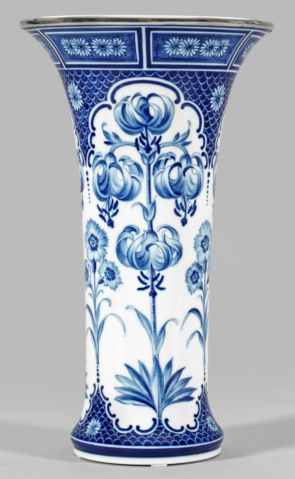 Trompetenförmiger Korpus mit weit ausschwingendem Rand auf eingezogenem, rundem Stand. Zwischen c-bogig gerahmten Schuppenfonds mit stilisierter Blüte, großflächiger, symmetrisch angelegter Floraldekor aus emporragenden, vierblütigen Türkenbundlilien im Wechsel mit Nelkenstängeln. Oberhalb umlaufende Bordüre aus blütengefüllten Viereckreserven. Fein abgestufte Blaumalerei in Unterglasur. Silbermontierter Rand. Gest. 925, Halbmond und Krone, Dresden Hermann Berndt sowie Juwelierstempel G. Schnauffer. Modell-Nr. D. 282. Undeutl. Jahreszeichen. Schwertermarke. H. 34,5 cm.