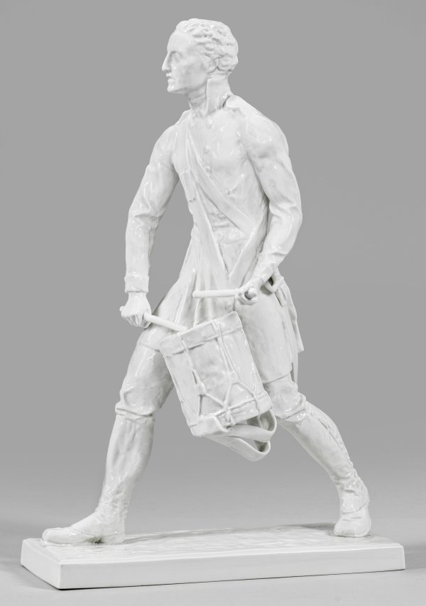 Weißporzellan. Auf rechteckiger, profilierter Plinthe, in weiter Schrittstellung voranschreitender Trommler in Uniform der Freiheitskriege. Entw. Walther Schmarje, 1913/14. Entw.-Monogr. WS. Modell-Nr. U 766 nach dem, von Alfred Oppel in den Schwarzburger Werkstätten neu ausgeformten Modell. Unw. rest.; Manufakturmarke. H. 41 cm.