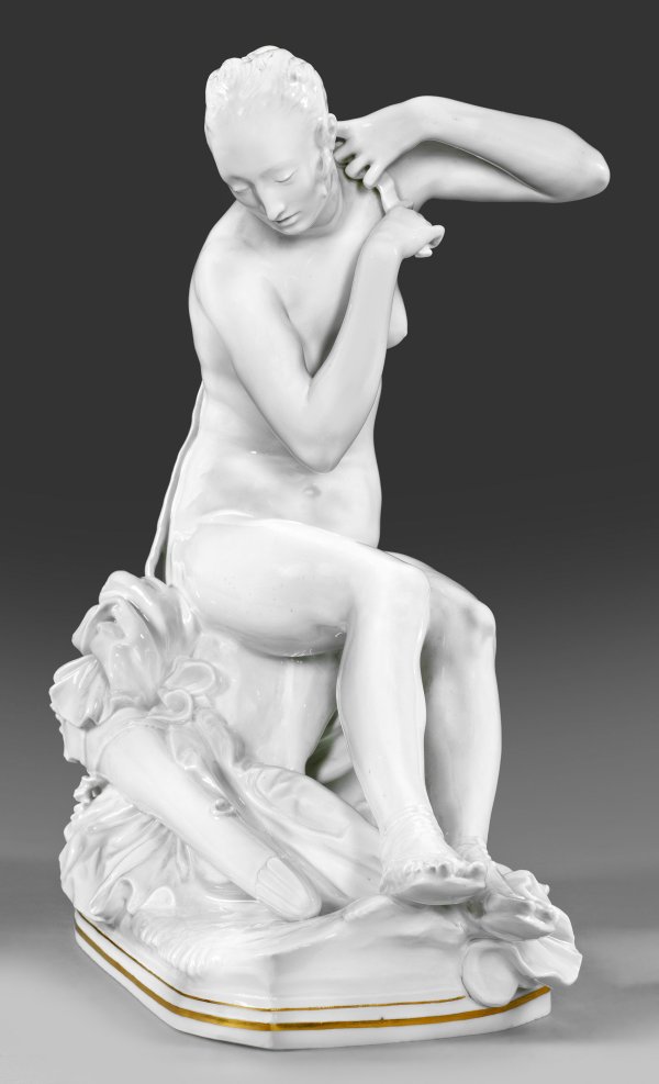 Weißporzellan mit Goldkonturierung. Über eckigem Profilsockel, auf einem Fels sitzende, unbekleidete Diana beim Bade mit gesenktem Haupt und nach vorn geneigtem Oberkörper, an den Füßen Sandalen tragend. Seitlich liegende, bereits abgelegte Kleidung sowie liegender, mit Pfeilen gefüllter Köcher. Entw. Paul Scheurich, um 1920/21. Modell-Nr. G 271. Minim. rest.; Schwertermarke. H. 31 cm.