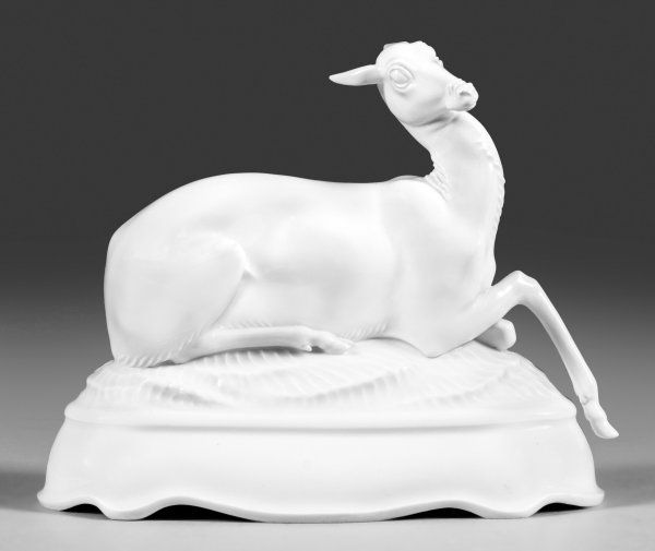Weißporzellan. Auf hohem, geschweiftem Ovalsockel über stilisiertem Terrain liegendes Reh. Entw. Max Esser, 1923. Modell-Nr. H 249. Rest.; Schwerter- sowie Weißwaren- und "Reineke Fuchs"-Marke. H. 13,5 cm. 17 cm x 8 cm.