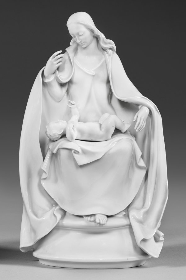 Weißporzellan. Auf gehöhtem, ovalem Sockel thronende Maria. Auf ihrem Schoß liegendes, nacktes Jesuskind. Entw. Ludwig Nick, um 1928/1930. Modell-Nr. A 1235. Jahreszeichen. Schwerter- und Weißwaren-Marke. H. 31,5 cm.
