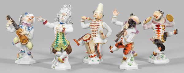 A complete serie of five porcelain figures from the "Intermezzo-Zwergenkapelle". Date mark. Crossed swords mark.