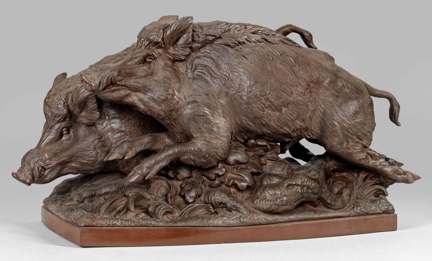 Böttgersteinzeug, teilw. poliert an Sockel, Hinterläufen und Schnauze. Rechteckiger Sockel mit plastischem, naturalistischem Terrain. Vollplastische Darstellung von zwei hastig nebeneinander laufenden und über Wurzel- und Eichenblattwerk springenden Wildschweinen. Entw. Erich Oehme, 1944. Entw.-Bez. mit Dat. 1944. Modell-Nr. R 228. Unw. best./rest.; Eingepresste Schwertermarke mit Zusatz "Böttgersteinzeug". H. 27,5 cm. L. 54 cm.