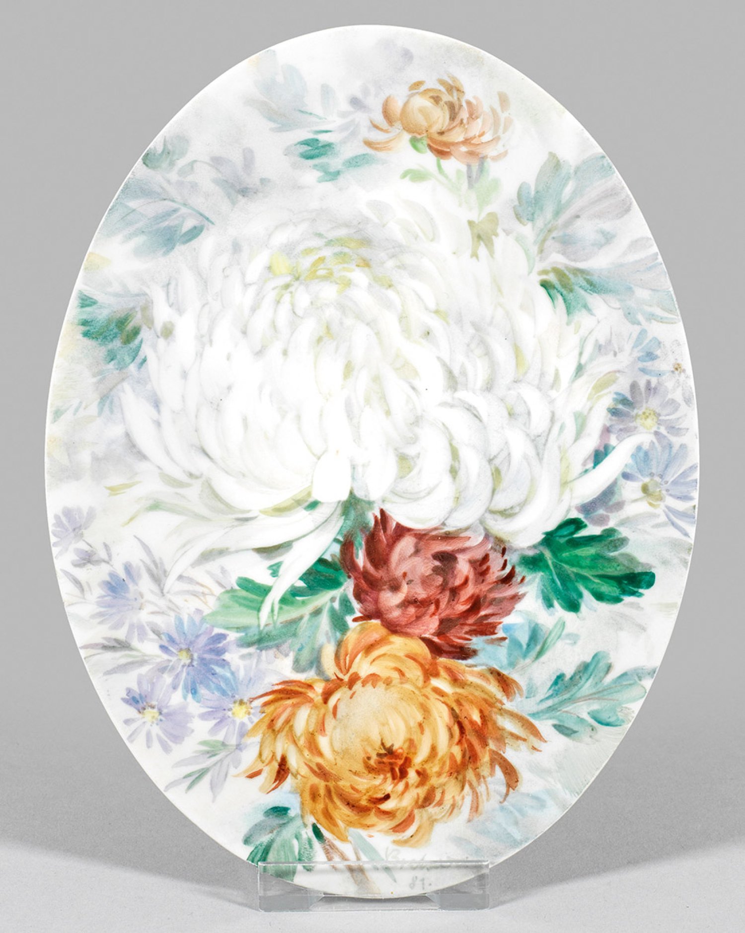 A small oval porcelain plaque with arrangement of Chrysanthemum and aster painted by V. Bretschneider and dated 1981. Unique exemplar. Painter's signature. Crossed swords mark.