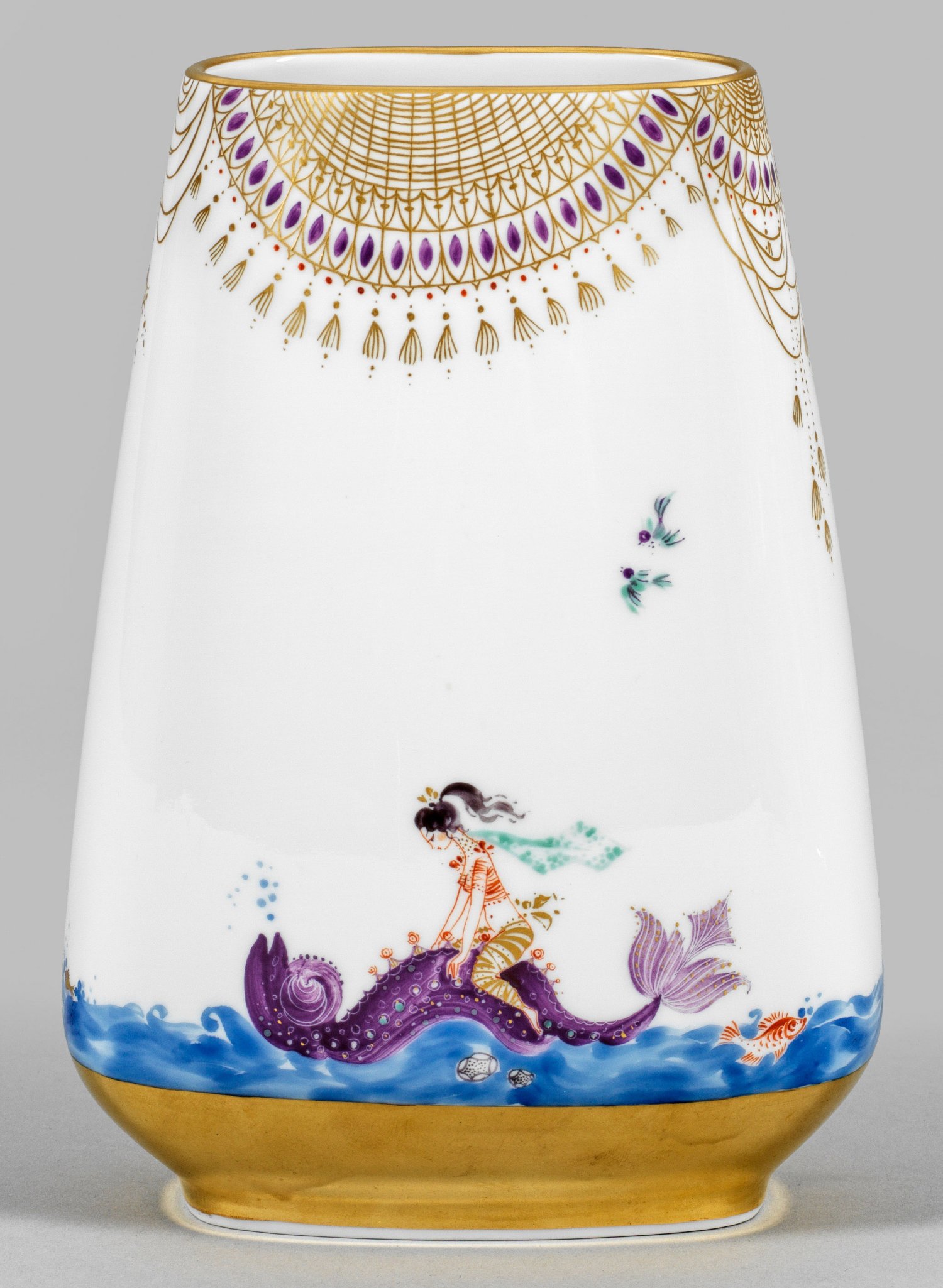Sich konisch verjüngender Korpus mit ovalem Querschnitt auf kurzem Standring. Beidseitig der Wandung, auf umlaufendem Wellenterrain szenische Darstellung aus den Erzählungen "1001 Nacht", Liebespaar in Gondel bzw. Dame, auf einem Delphin reitend. Oberhalb umlaufender Goldvorhang. Dekor-Entw. Prof. Heinz Werner. Polychrome Malerei mit reichem Poliergolddekor. Teilvergoldung. Schwertermarke. H. 21 cm.