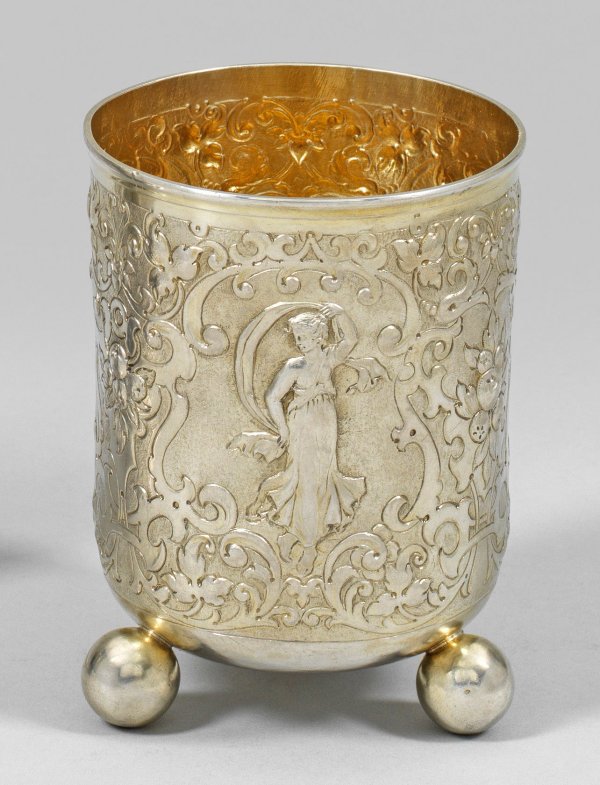 Silber, voll vergoldet. Über drei ausgestellten Kugelfüßen zylindrischer Korpus mit schmaler, glatter, durch zarte Profillinien abgesetzter Randzone, übergehend in gering ausgestellten Lippenrand. Auf der Wandung drei passig geschweifte Kartuschen mit allegorischen Frauendarstellungen, flächendeckend umzogen von reliefiertem Blattwerk, Voluten, C-Schwüngen und Fruchtbündeln über fein punziertem Grund. Innen vergoldet. Gest., Herstellerzeichen, Pseudomarken. Gew. ca. 235 g. H. 12,5 cm.