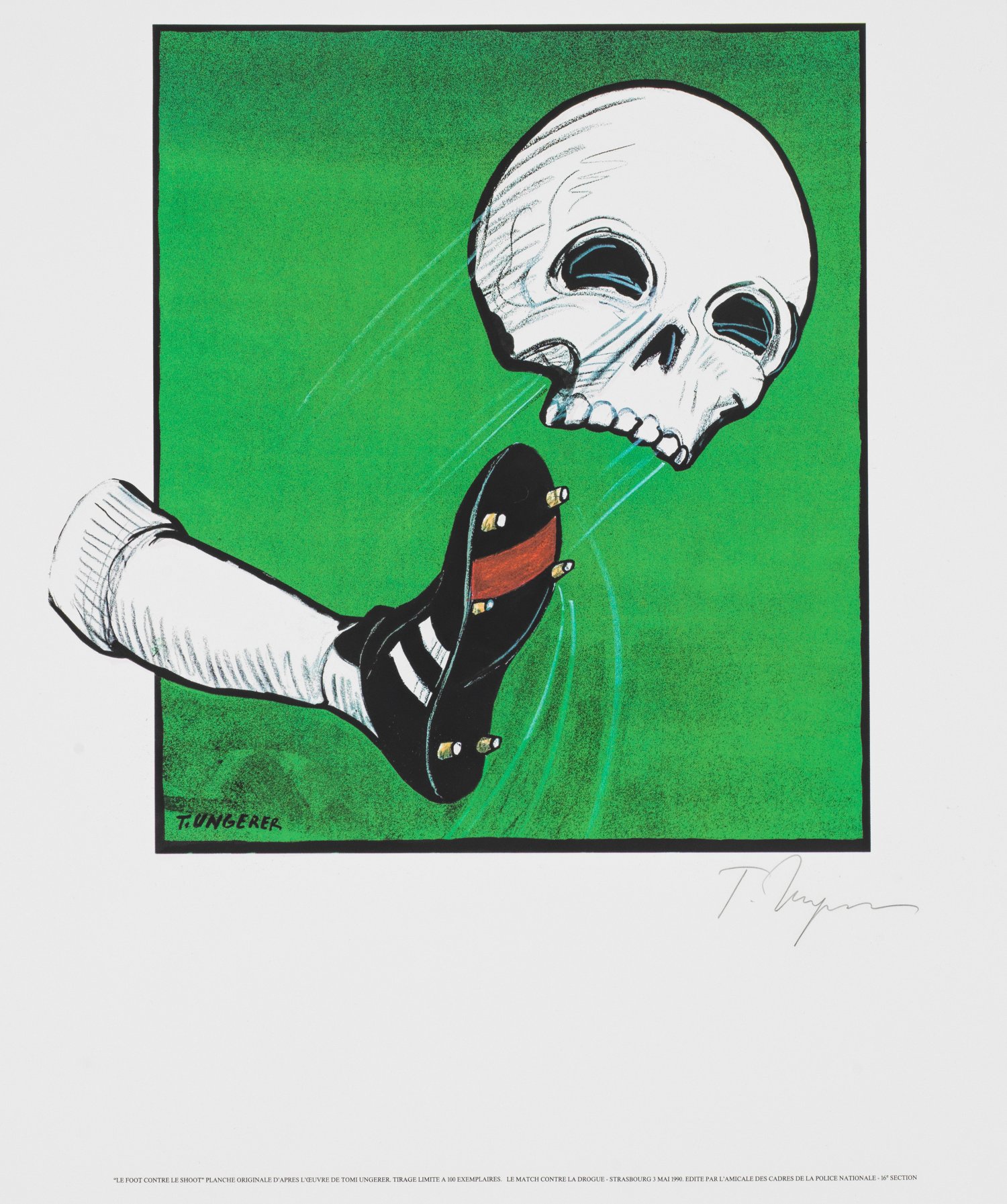 Farbserigraphie/Velin, 1990. Sign. in Bleistift, außerdem im Druck sign.; Limitierte, unnummerierte Auflage von 100 Expl.; Hrsg. L'Amicale de la Police Nationale 16e section, zum Spiel gegen die Drogen, Straßburg, 3. Mai 1900. Eindringliche Darstellung eines Fußballerbeines, das einen Totenschädel wegschießt. Blatt ca. 68 cm x 53,5 cm.