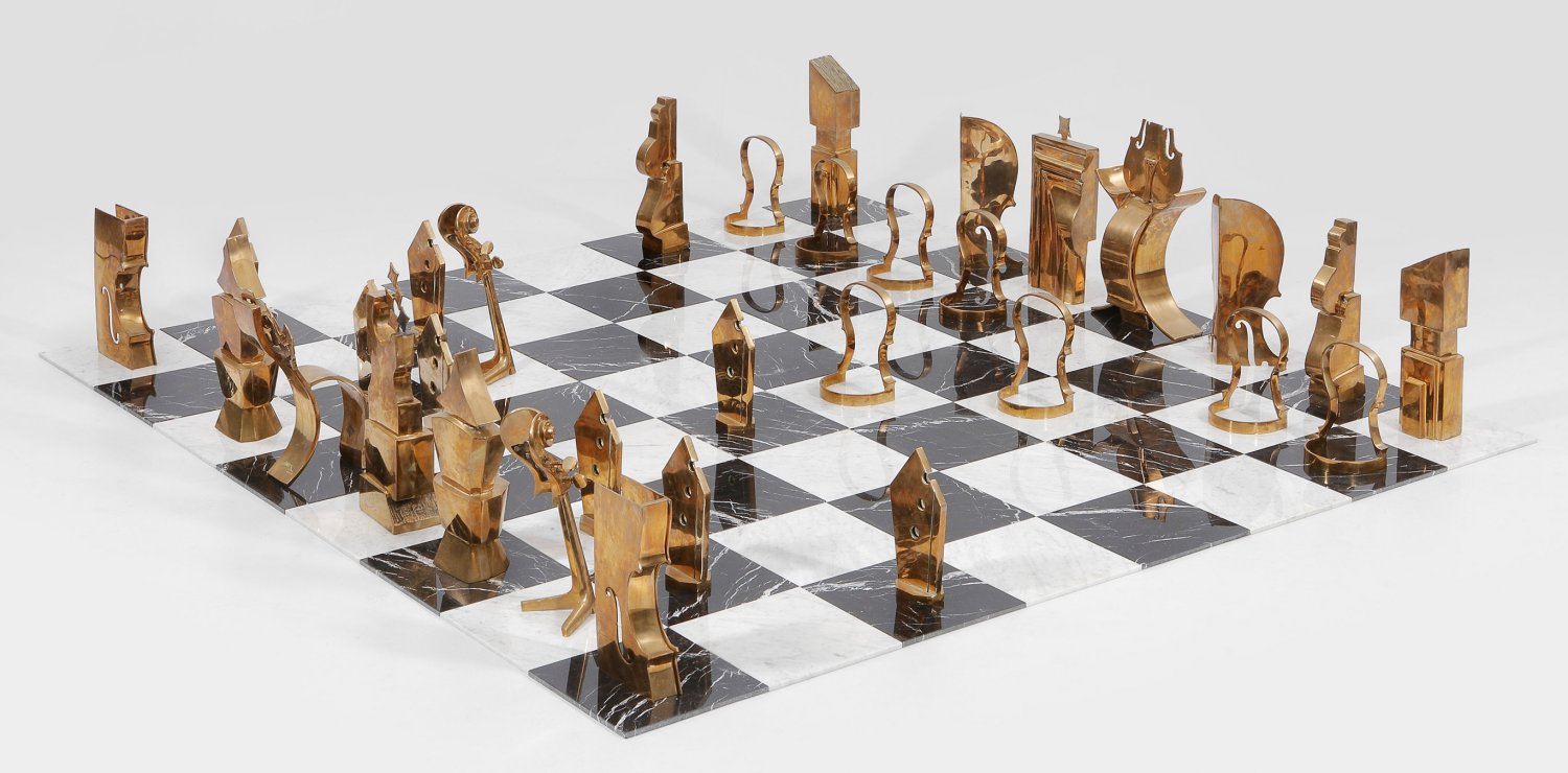 Bronze. Schachbrett aus weißen und schwarzen Marmorfliesen. Entw. Arman und Georges Boisgontier, 1986. Limitierte Auflage von 5 Exemplaren plus 2 "EA"-Exemplaren. Bei dem vorliegenden Lot handelt es sich um "EA 1/2". Außer dieser monumentalen Version gab es eine kleine Ausführung in einer Auflage von 75 Exemplaren. Dieses Schachspiel wurde in künstlerischer Zusammenarbeit zwischen dem französisch-amerikanischen Objektkünstler und Mitbegründer des Nouveau Realisme - Arman - und dem französischen Bildhauer Georges Boisgontier gemeinsam geschaffen. Jeder der Künstler gestaltete jeweils 16 Figuren, die in unterschiedlich kubistisch abstrahierter bzw. surrealistischer Weise stilisierte Streichinstrumente darstellen. In Armans Figuren drückt sich seine Leidenschaft für sinnliche, weibliche Formen der Streichinstrumente aus, die ab den 60er Jahren ein zentrales Motiv seines Oeuvres waren, indem er Violinen und Kontrabässe häufig zertrümmerte, verbrannte und zersägte. Dagegen verwandeln sich Boisgontiers straff abstrahierte Figuren durch ihre archaischen, geometrischen Formen gleichsam in moderne Idole voller Symbolik. Für die Künstler ist das Schachspiel zugleich eine Allegorie des Lebens: Als von der Natur und seinen eigenen widersprüchlichen Gefühlen beherrschte Figur steht der Mensch ständig unter Kontrolle. Werke von Arman, der 1964, 1968 und 1977 auf den Documenta-Ausstellungen in Kassel vertreten war, befinden sich im u. a. im MoMA in New York, im Hirshhorn Museum in Washington und in der Tate Gallery in London. Schachbrett ca. 244 cm x 244 cm; Figuren-H. ca. 26 cm-52 cm, B. ca. 19 cm-21 cm, T. ca. 10 cm-28 cm.