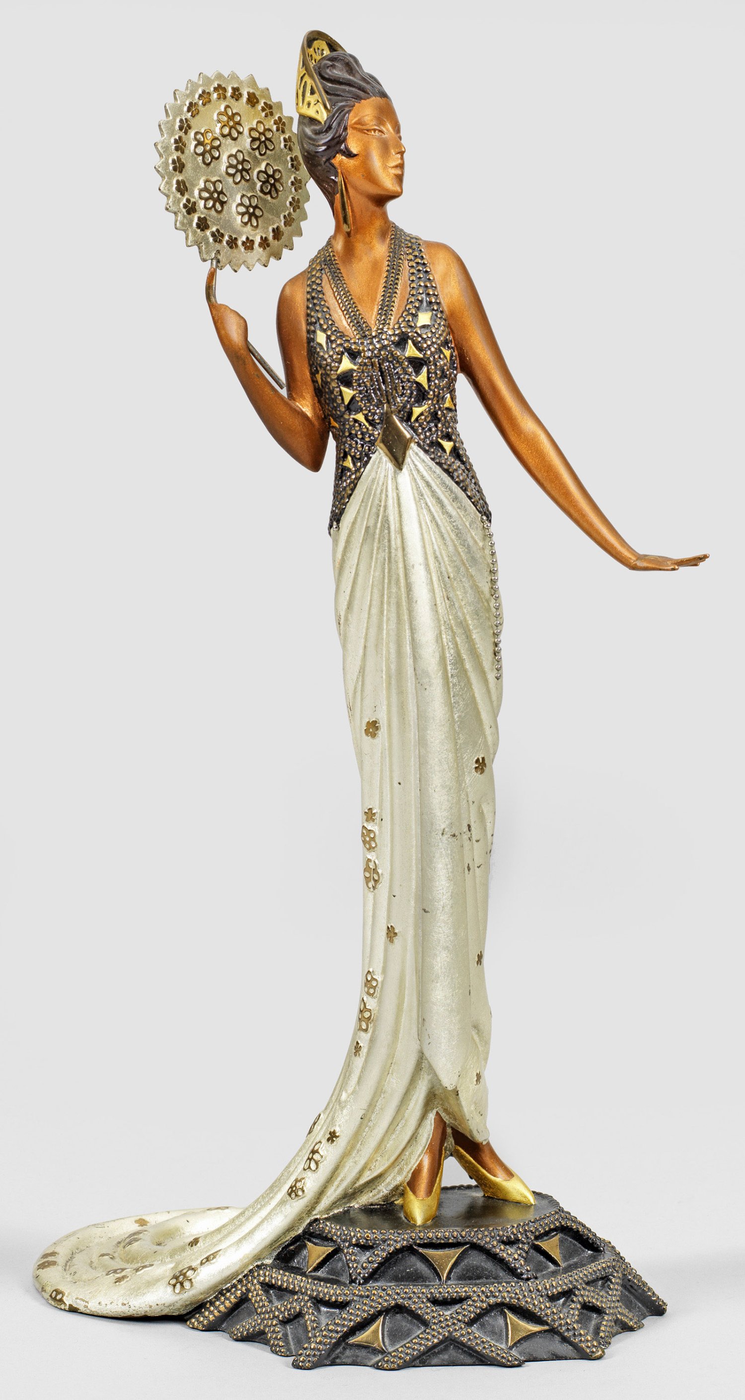 Bronze mit Kaltbemalung in Silber-, Gold- und Bronzetönen sowie Schwarz, 1989. Sign., nummeriert 444/500, dat. "C. 1989", Stempel des Hrsg. "SEVENARTS LONDON" und Gießermarke. Im Art Déco-Stil gestaltete Statuette einer jungen, mondänen Dame in langem Abendkleid mit Fächer, die Proportionen der Figur überlängt. Erté war von der tragisch-romantischen Geschichte der Fedora fasziniert, die auch in der gleichnamigen Oper von Umberto Giordano (1898) erzählt wurde, später gesungen u. a. von Maria Callas. Um 1920 schuf Erté bereits mit der Bronze vergleichbare Kostümentwürfe für die Interpretin Ganna Walska in der Titelrolle. H. 48,7 cm.