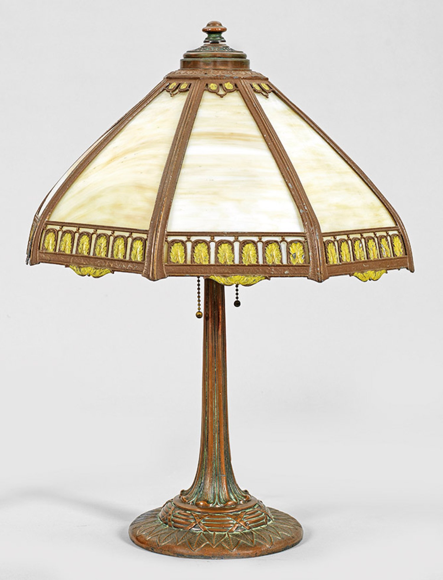 3-flg.; Kupfer und Weißmetall, teilw. farbig lackiert, sowie weiß-gelb marmoriertes Opalglas. Über gestuft ansteigendem, blattreliefiertem Rundsockel sich konisch verjüngender Schaft als Träger für die Fassungen. Oberhalb kuppelförmiger, durchbrochen gearbeiteter Lampenschirm aus schmalen Stegen. Elektrifiziert. H. 58 cm.