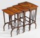 4-tlg.; Mahagoni, massiv und furniert sowie Einlagen aus Nussbaum und Rosenholz. Durchbrochen gearbeitetes Gestell aus sich konisch weitenden Profilstreben und volutenartigen Beinen, als Träger für gerundete Deckplatten. Jeweils flächendeckender Intarsiendekor aus Rosen- und Wickenblüten, Knöterichranken und Mistelzweigen. Ein Tisch bez. L.Majorelle. H. 72,5 cm - 77 cm. 44 cm -60 cm x 40 cm.