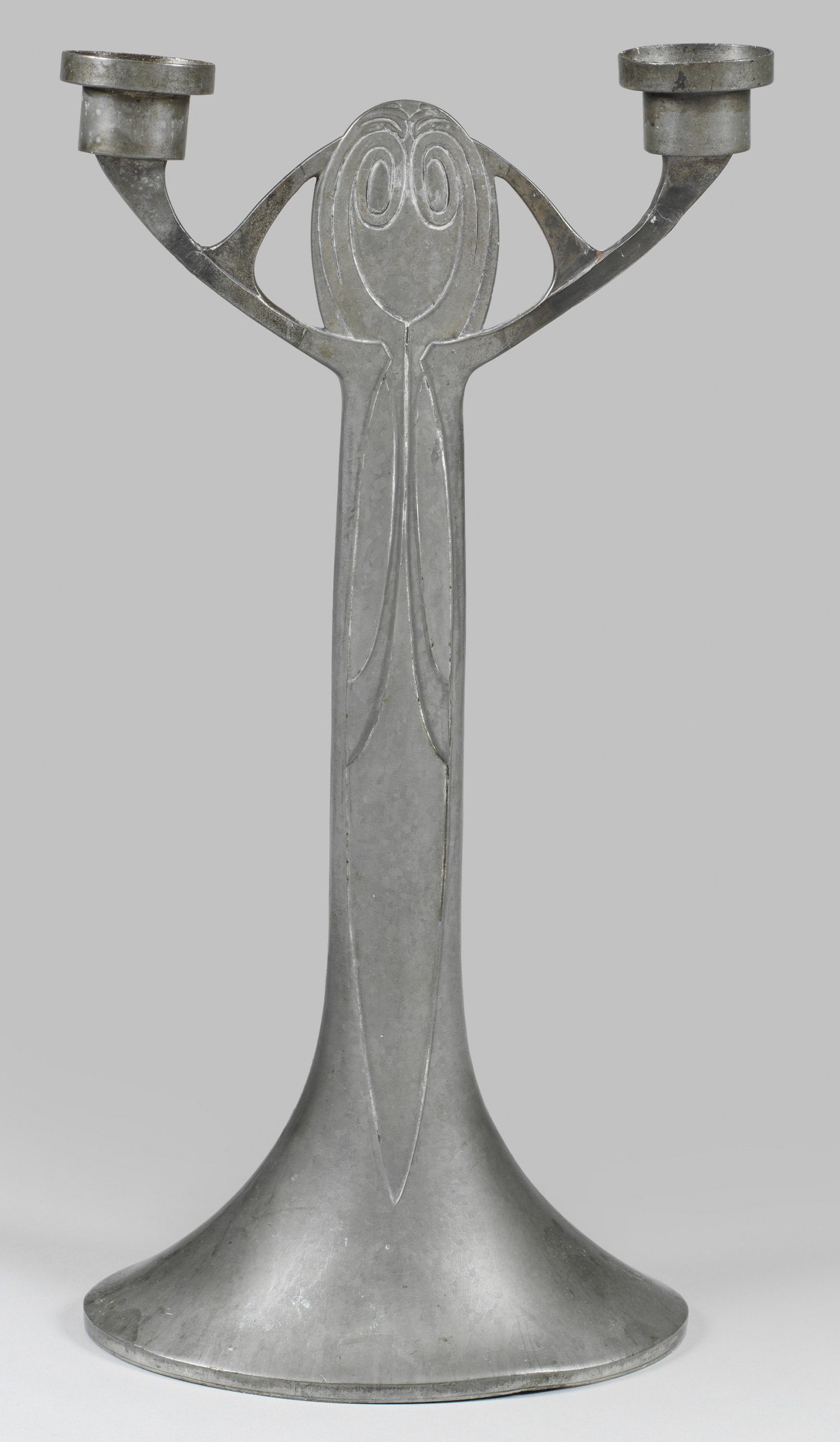 Zinn. 2-flg.; Auf querovalem, trompetenförmig ausgestelltem Stand einschwingender, oberhalb abgeflachter Schaft mit ovoidem Abschluss. Seitlich zwei gebogte Arme, in zylindrischen Tüllen endend. Geschwungener Reliefdekor aus vegetabilen Zierbändern. Entw. Josef Maria Olbrich, um 1901/1902. Modell-Nr. 1819. Ligiertes Künstler-Monogr.; Firmenmarke "E. Hueck Edelzinn". H. 36,5 cm.