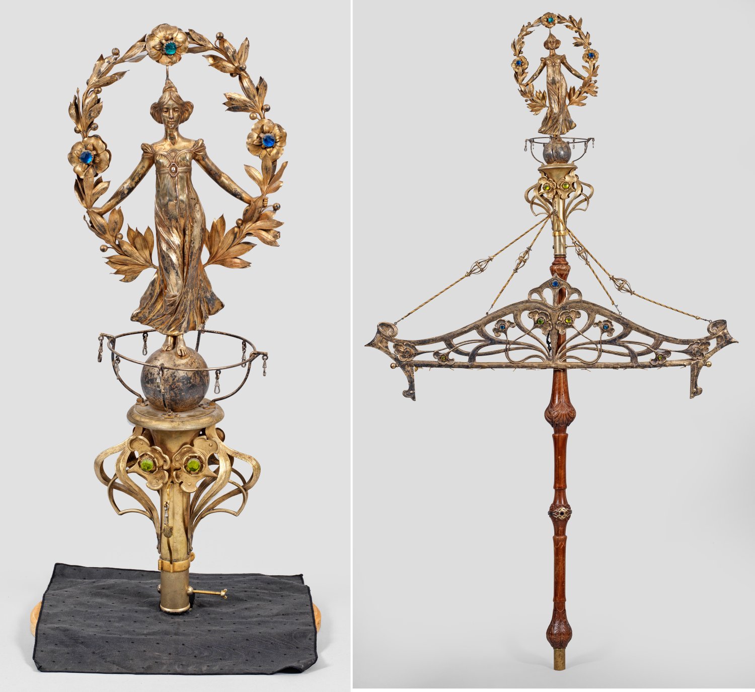 Messing, versilbert sowie Walnussholz, teilw. gedrechselt und geschnitzt. Lange balusterschaftähnliche Fahnenstange aus Holz mit Messingmontierung, bekrönt von abnehmbarer, durch Feststellschraube gehaltener Spitze mit kurzem, sich konisch erweiterndem Schaft. Der Ansatz umzogen von filigranen, durchbrochen gearbeiteten, vegetabilen Stängeln, in stilisierten Ginkoblättern und kleinen Blüten endend. Darüber, auf einer Kugel stehend, eine vollplastische, weibliche Statuette mit hoch tailliertem, medaillonverziertem Kleid. In ihren Händen, ein übergreifender, ihren Oberkörper rahmender, zarter Kranz aus Lorbeerzweigen- und blättern, gegliedert von Blüten. Zentral zwischen Spitze und Schaft montiert ein sog. Bänderring aus schmalen Streben mit acht kleinen Karabinerhaken zum Aufhängen von Fahnenbändern. Unterhalb am Schaft ein weiterer Haken, als Aufhängung für die an vier Kordelbändern korrespondierend aus durchbrochen gearbeiteten, vegetabilen Blattranken und -stängeln, passig geschweifte, horizontale Fahnenhalterung. Fahnenstange, Halterung und Spitze besetzt mit gefassten und geschliffenen, apfelgrünen sowie dunkelblauen Glassteinen. Ges.-H. 235 cm. B. 132 cm.