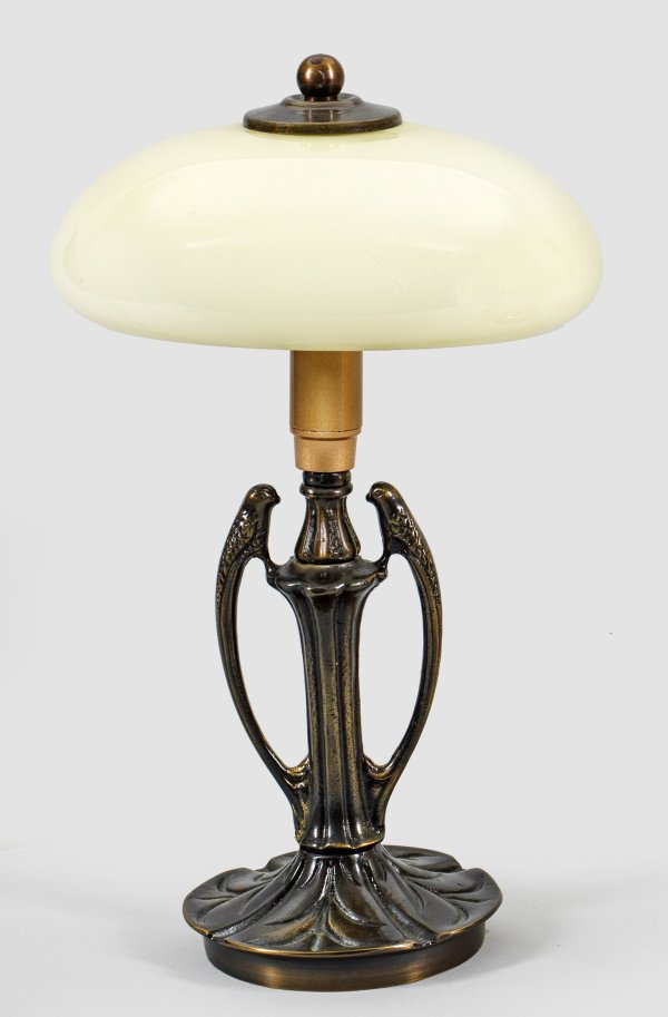 1-flg.; Bronze, patiniert und cremefarbenes Glas. Über reliefiertem Rundsockel gegliederter Balusterschaft, flankiert von stilisierten Papageien als Träger für Leuchtmittel. Gewölbter Lampenschirm. Elektrifiziert. H. 34 cm.