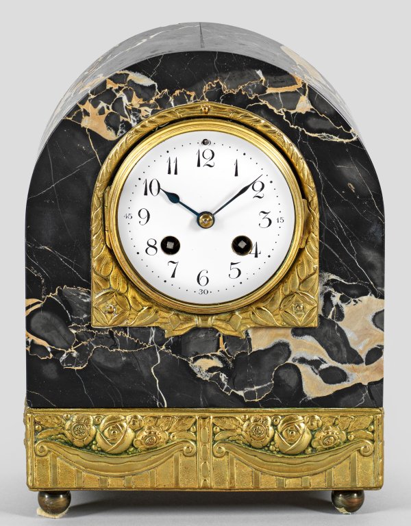 Schwarz-beige gemaserter Marmor und Messing. Rechteckiger Korpus mit gewölbtem oberen Abschluss auf Kugelfüßen. Schauseitig reliefierter Dekor mit Rosenblüten. Verglastes Zifferblatt. Pendulenwerk mit Pendelfeder sowie Halbstundenschlag auf Glocke. H. 25 cm. 19 cm x 9,5 cm.