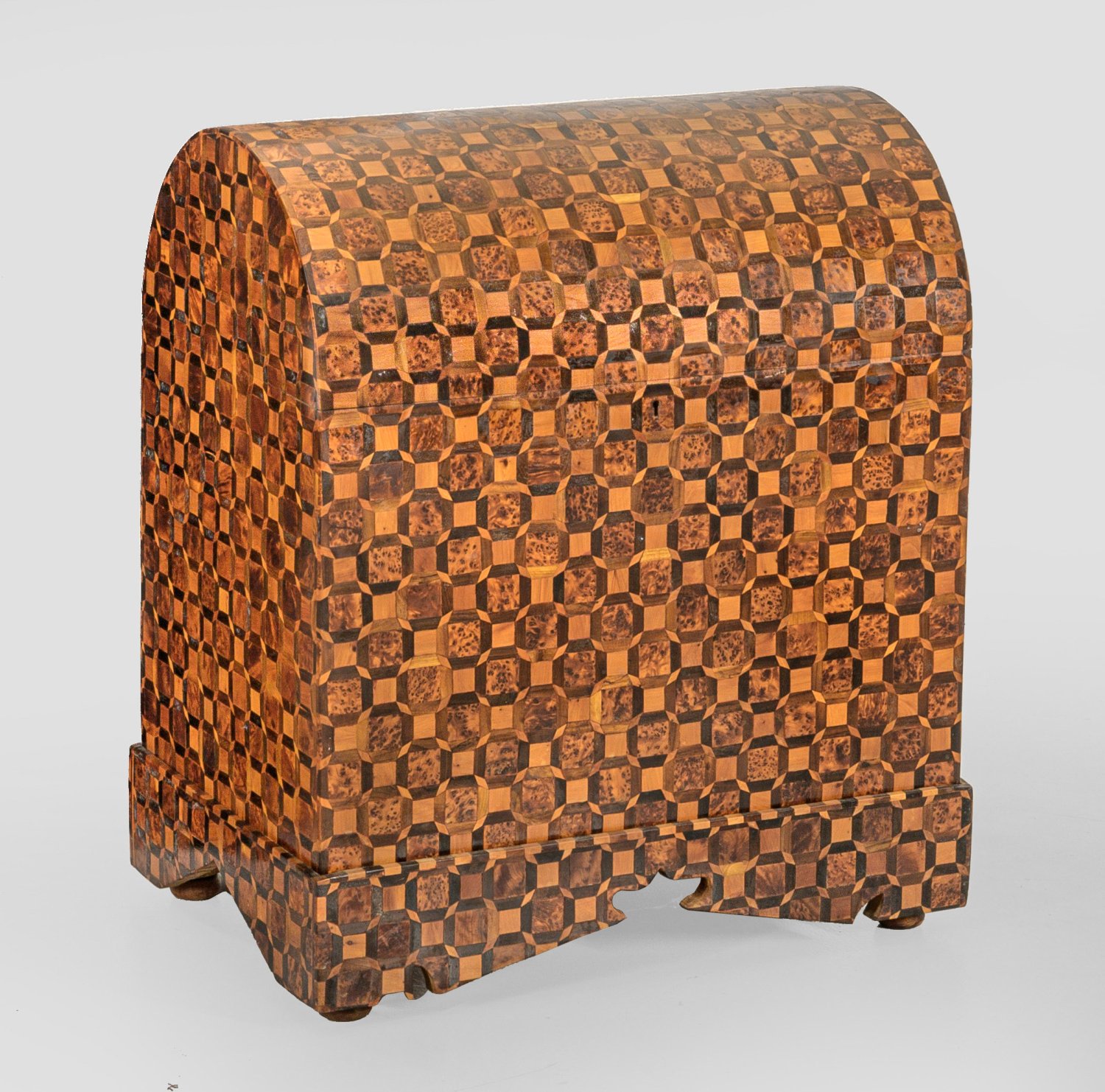Thujamaser, Nussbaum und Palisander, furniert. Gerader, rechteckig angelegter Korpus auf schmalem, gesägtem Zargensockel. Hochgewölbter Runddeckel. Flächendeckender, fein gearbeiteter Marketeriedekor aus Rautenfeldern und Gitterwerk. H. 74,5 cm. 63 cm x 43 cm.