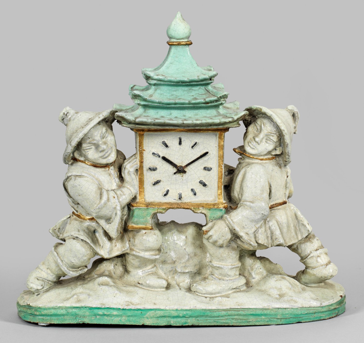 Irdenware, dunkelbrauner, schamottierter Scherben. Vollplastische Gruppe, auf einem ovalen Sockel zwei Chinesen, ein mittiges Uhrengehäuse in Pagodenform tragend. Weißgraue und helltürkisgrüne, craquelierte Glasur, die Uhrzeiten in Schwarz gemalt, die Konturierung in goldener Kaltmalerei. Ligiertes Künstler- oder Werkstatt-Monogr.; H. 39 cm.