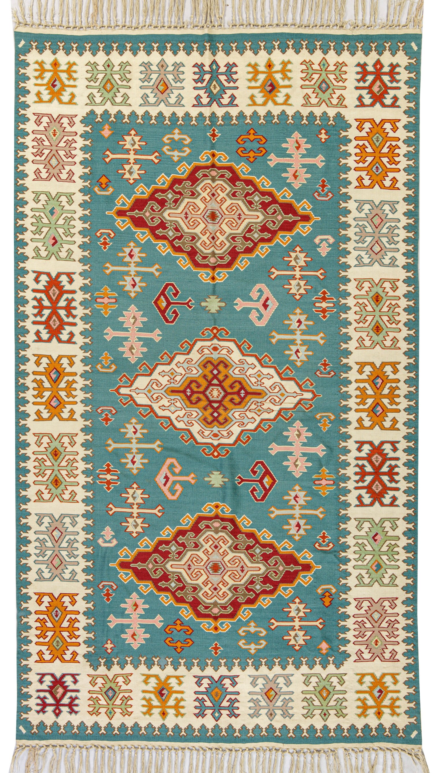 Kurdistan. Wolle auf Wolle, fein flach gewebt. Im türkisfarbenen Innenfeld drei große gereihte, umlaufend hakenbesetzte Rautenmotive in Rot- und Cremetönen sowie gestreute Musterung aus Haken- und Kreuzmotiven. Umlaufend breite, cremefarbene Bordüre mit großflächig angelegter Musterung in Grün- und Orangetönen. 246 cm x 143 cm.