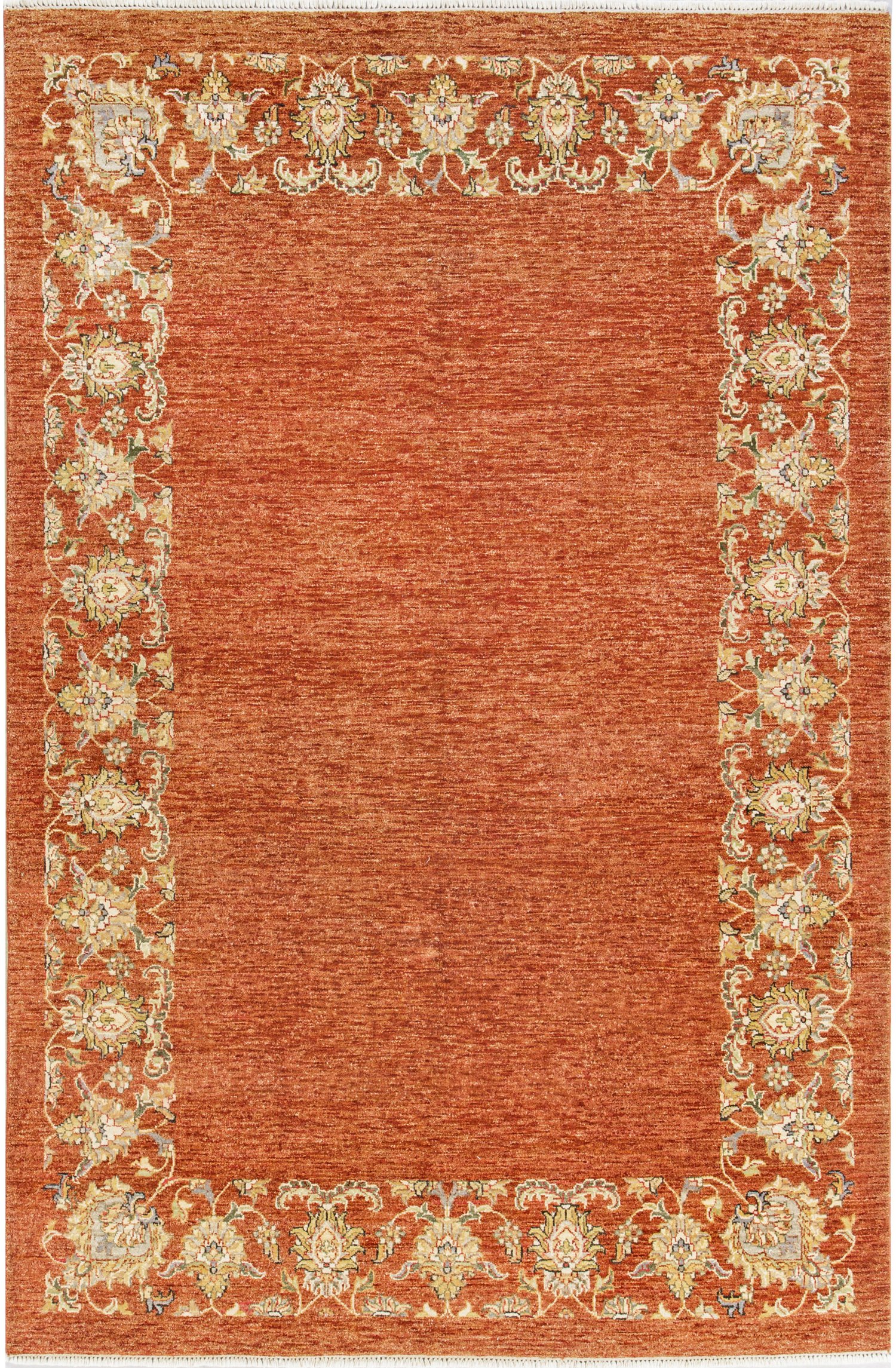 Afghanistan. Wolle auf Baumwolle. Naturfarben. Auf kupferfarbenem, abraschiertem Fond breite Palmettenbordüre in unterschiedichen Beigetönen. 250 cm x 167 cm.