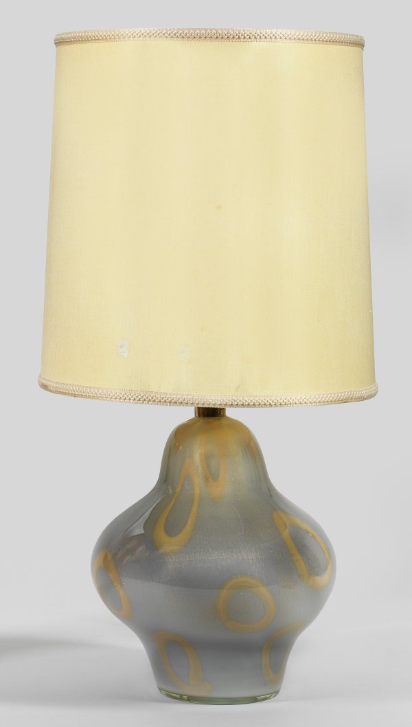 1-flg.; Hellgraues, in unterschiedlichen Gelbtönen durchzogenes Glas mit Einschmelzungen aus fein zersprengter Goldfolie. Balusterförmiger Korpus als Träger für Leuchtmittel. Zylinderförmiger Lampenschirm. Etikett "Made in Murano Italy". Elektrifiziert. H. 74,5 cm.