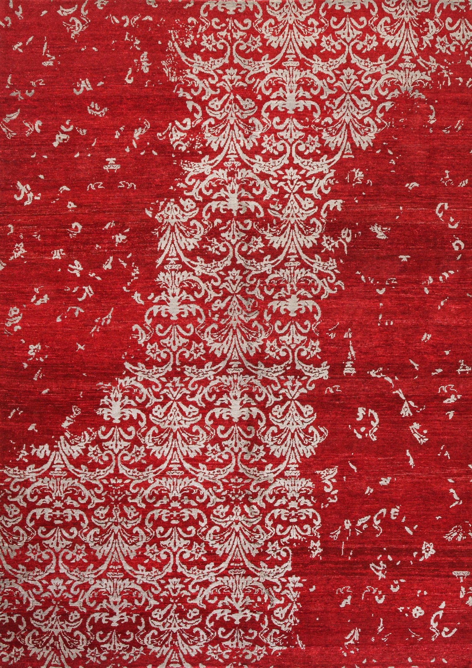 Wolle und merserisierte Baumwolle auf Baumwolle. Auf bordeauxrotem, leicht abraschiertem Fond flächendeckende, asymmetrisch angelegte Musterung aus dicht angeordnetem Rankenwerk und Volutenmotiven in Hellgrau. 245 cm x 173 cm.