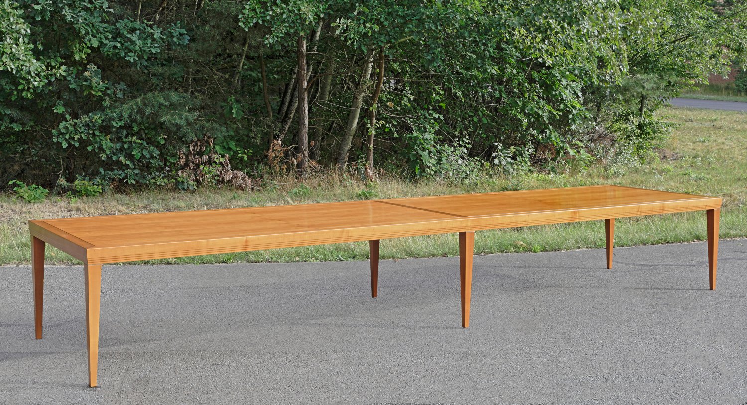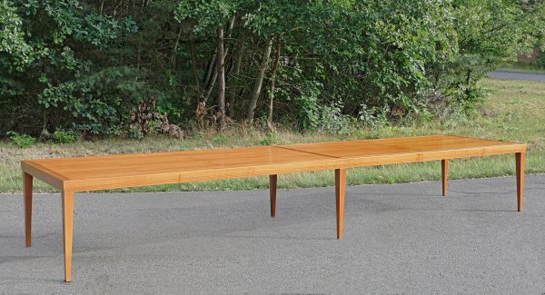 als exklusive Sonderanfertigung. Kirschbaum, massiv und furniert. Gerade, schmale, getreppt ansteigende Zarge auf konischen Vierkantbeinen, mit flachen, leicht zurückgesetzten Messingscheiben als Träger für entsprechende, kräftige Deckplatte mit umlaufenden Rillendekor. H. 78 cm. 558 cm x 125 cm.