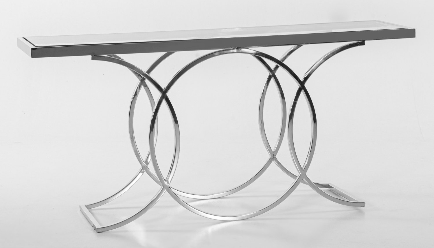 Metall, vernickelt und farbloses Glas. Offen gestalteter Korpus aus schmalen, gekanteten bzw. stark gebogten Streben und Stegen sowie großen verschränkten Kreismotiven. Eingelegte Deckplatte. H. 75 cm. 160 cm x 40 cm.