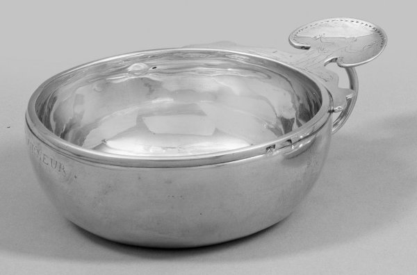 sog. Taste vin. Silber. Flache Schale mit gering eingezogenem Stand und gerundeter, glatter Wandung. Über Ringgriff eine passig geschweifte, flache Handhabe mit gravierter Darstellung eines Mannes, eine Flasche Wein sowie ein brennendes Herz in der Hand haltend. Auf dem Wandungsrand Besitzerinschrift "Pierre Le Tourneur". Gest., Beschauzeichen, unbekanntes Meisterzeichen. Gew. ca. 100 g. H. 4 cm. D. 8,5 cm.