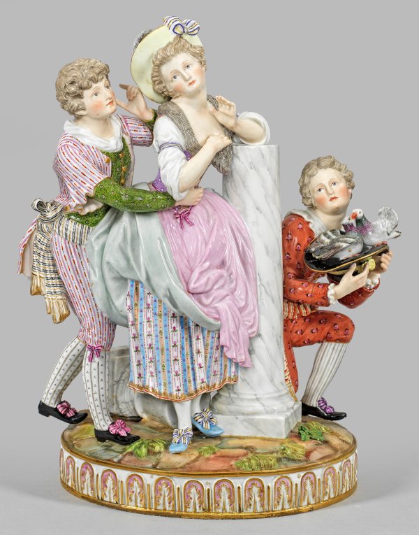 Ovaler, von reliefierter Akanthusblattbordüre umzogener Sockel mit vollplastischer, szenischer Darstellung. Auf naturalistischem Terrain, gestützt auf eine Marmorsäule stehende junge Dame in gestreiftem Rock mit rosafarbener Schürze sowie gepunktetem Mieder. Ihr fein gezeichnetes Haar ist von einem pompösen Federhut bedeckt. Seitlich herannahender Kavalier in gestreiftem Anzug und grün gemustertem Hemd. Hinter der Säule hockender Knabe in beobachtender Position, in den Händen einen schwarzen Hut haltend, auf dem ein schnäbelndes Taubenpaar sitzt. Rückseitig liegender Säulenstumpf. Polychrome Malerei mit Goldstaffage. Entw. Johann Carl Schönheit, 1787. Modell-Nr. I 60. Unw. rest./best.; Schwertermarke. H. 31 cm.