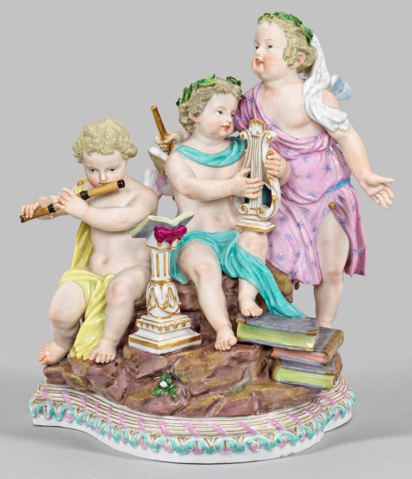 Frontseitig geschweifter Sockel mit reliefierten Ornamentbordüren. Über felsigem Terrain komponierte Gruppe aus drei Amoretten mit Querflöte und Notenpult, Lyra und Trompete. Mittig sitzender Putto als Apoll mit Lorbeerkranz und Lyra. Zu ihren Füßen liegender Bücherstapel mit Violine und Bogen. Polychrome Malerei mit Goldstaffage. Entw. Michel Victor Acier. Modell-Nr. 10. Rest.; Minim. best.; Schwertermarke. H. 22,5 cm.