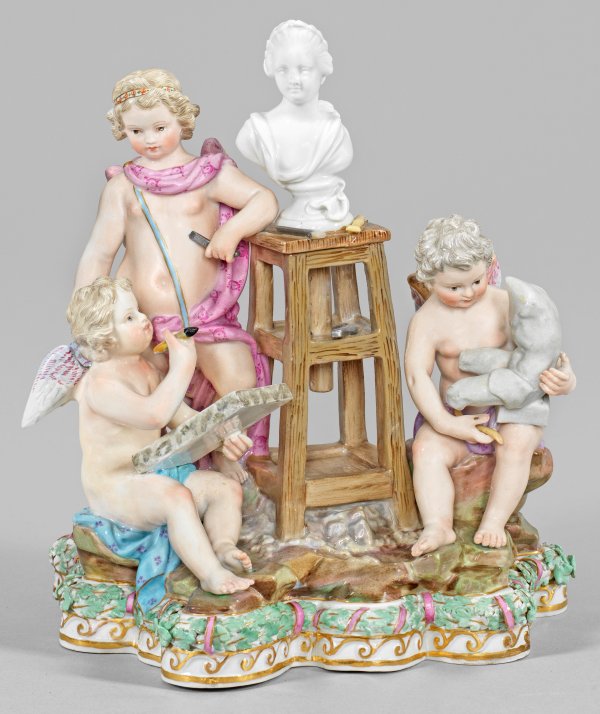 Frontseitig passig geschweifter Sockel mit reliefierten Wellenband- und Eichenblattbordüren. Über felsigem Terrain komponierte Gruppe aus drei Amoretten mit Hammer und Meißel, Zeichenstift und Skizzentafel bzw. mit dem sog. Torso von Belvedere. Mittig stehender Bildhauerbock mit Werkzeug und Büste der lorbeerbekränzten Zarin Katharina II. von Russland. Polychrome Malerei mit reicher Goldstaffage. Entw. Michel Victor Acier. Modell-Nr. 4. Rest.; Minim. best. Schwertermarke. H. 20 cm.