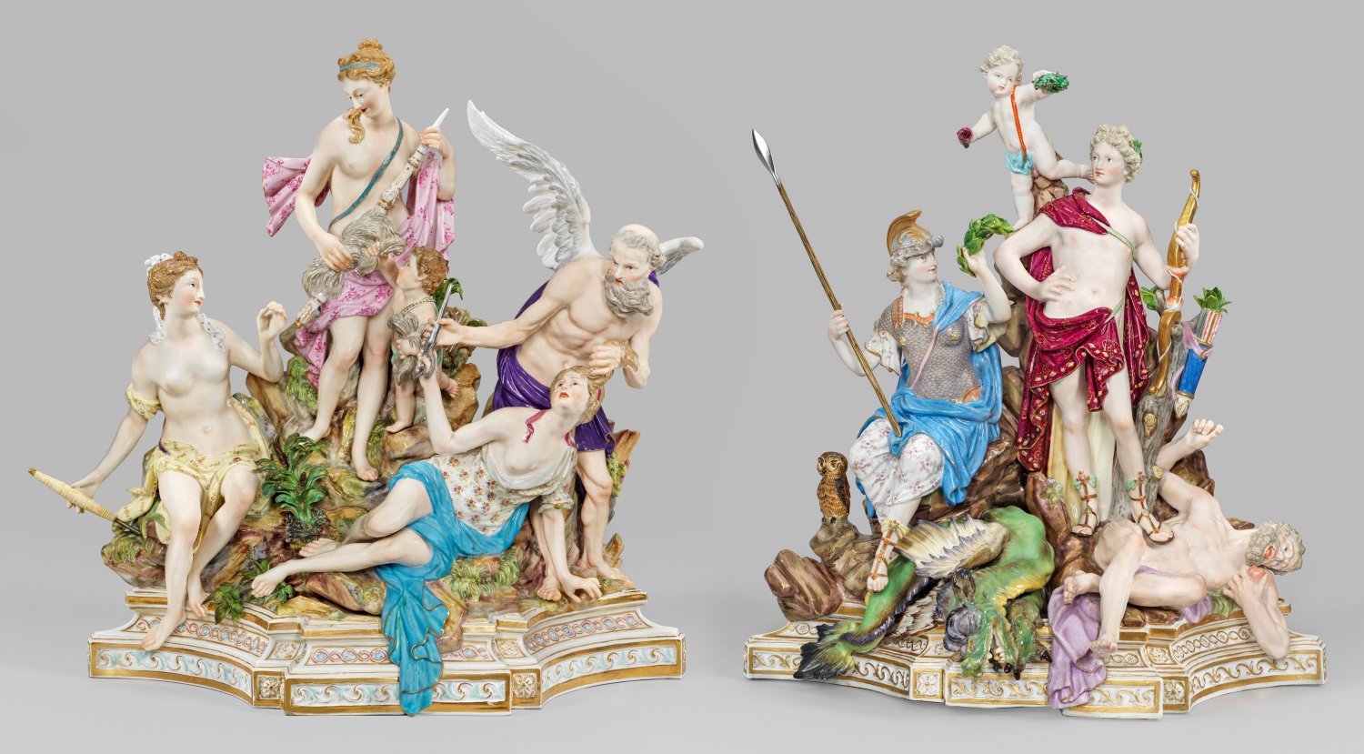 als Gegenstücke. 2-tlg., verschraubt. In der Front architektonischer, verkröpfter Sockel mit reliefierten Ornamentfriesen. Über Felsterrain komponierte Gruppe der drei römischen Schicksalsgöttinnen, der sog. Parzen. Mittig erhöht stehende, von einem Putto mit Wollbündel begleitete Clotho, zusammen mit der links sitzenden Lachesis, die Lebensfäden der Menschen spinnend. Rechts stehender Chronos, der Gott der Zeit, die vor ihm liegende Atropos an den Haaren zurückhaltend, um sie am Abschneiden des Fadens zu hindern. Als Gegenstück der gehöht stehende Apoll, Gott der Künste des Bogenschießens, in stolzer Pose. Seine linke Hand einen Bogen haltend, die Rechte ist in die Hüfte gestützt. Neben ihm stehende Minerva, Göttin der Weisheit und des Krieges, mit Helm, Harnisch und Speer. Zu den Füßen hockende Eule als ihr Attribut. Apoll steht mit dem linken Fuß auf einem, am Boden liegenden alten Mann als Personifikation des Neides. Daneben der niedergestreckte Python, mythologischer Drache, den Apoll der Sage nach mit einem Pfeil tötete. Oberhalb der Gruppe stehender Putto mit Lorbeerkranz. Polychrome Malerei mit reicher Goldstaffage. Entw. Johann Joachim Kaendler, 1774. Modell-Nr. 32 und 33. Unw. rest.; Schwertermarke. H. 37 cm – 38 cm. B. 34 cm – 35 cm.