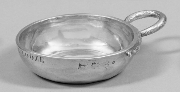 sog. Taste vin. Silber. Flache Schale mit gering eingezogenem Stand und gerundeter, glatter Wandung mit plastischem Ringgriff in Gestalt einer Schlange mit reliefiertem Schlangenhautdekor. Auf dem Wandungsrand bez. mit Ortsangabe sowie auf der Unterseite graviertes Wappen mit Löwe und französischer Lilie im Schild. Gest., Beschauzeichen, unbekanntes Meisterzeichen "P J T". Gew. ca. 115 g. H. 2,5 cm. D. 8,5 cm.