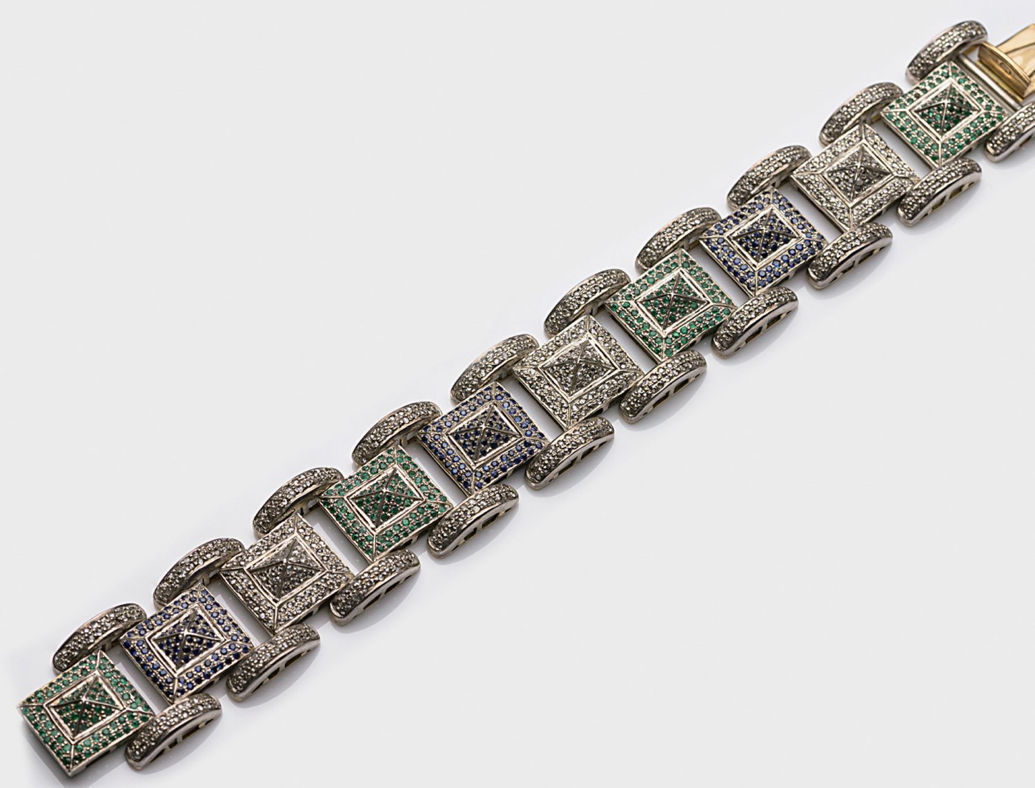 Bracelet set with diamonds approx. 4,33 ct., sapphires approx. 3,56 ct. and emeralds approx. 2,46 ct., in silver and 14 k gold.