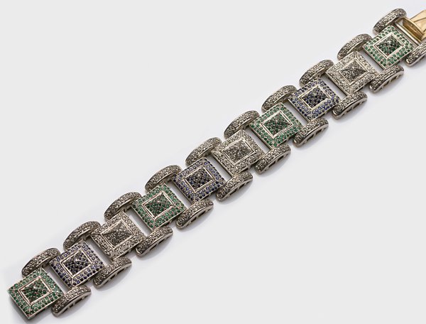 Silber und Gelbgold, gest. 56 (583). Besetzt mit Saphiren von zus. ca. 3,56 ct., Smaragden von zus. ca. 2,46 ct. und Diamanten von zus. ca. 4,33 ct., in Pavéfassung. Gew. ca. 53,90 g.