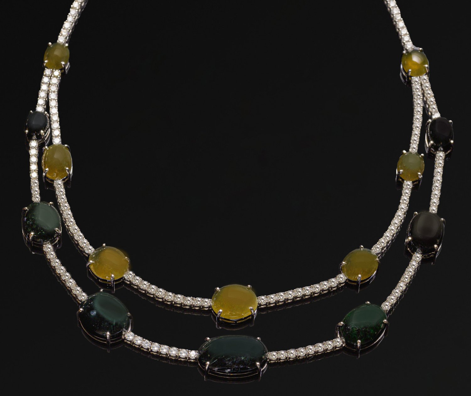 Necklace set with brilliants approx. 10,50 ct. and jade approx. 69,636 ct. in 18 k white gold. Certificate included.