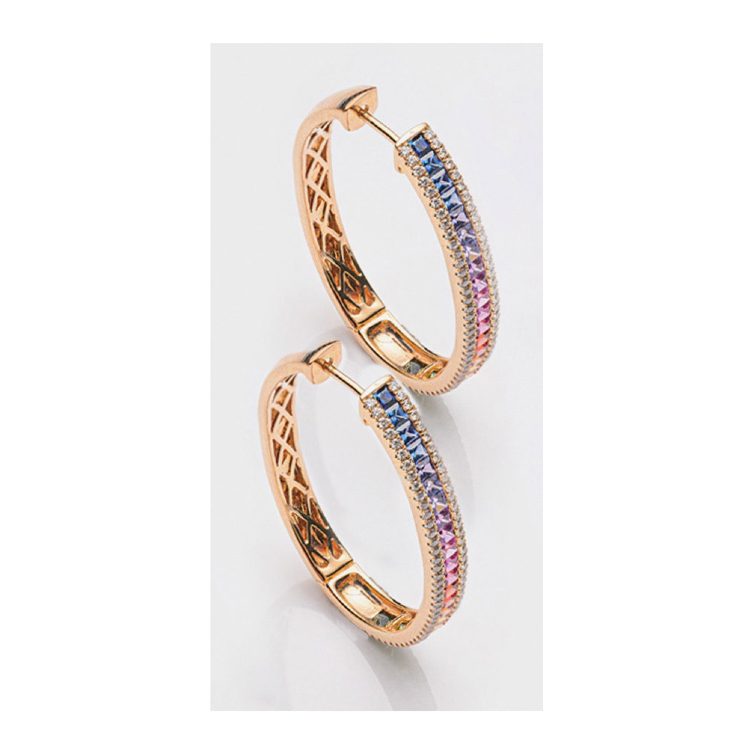 Roségold, gest. 750. Schauseitig linear besetzt mit unbehandelten Saphircarrées in den Farben Grün, Gelb, Orange, Violett und Blau von zus. ca. 2,58 ct., gerahmt von Brillanten von zus. ca. 0,77 ct. (G/vs). Ges.-Gew. ca. 12,90 g.
