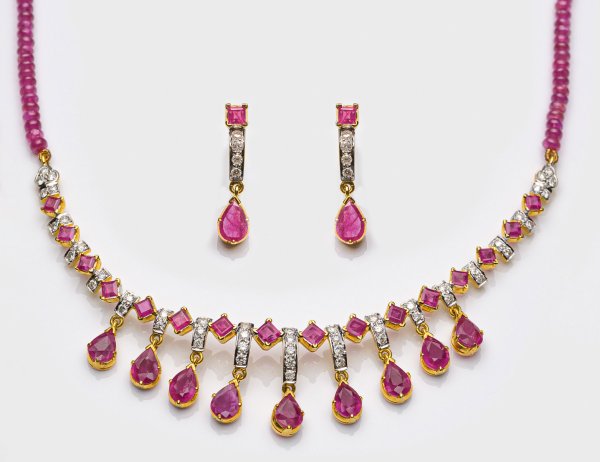Collier und korrespondierende Ohrringe. Gelbgold, 18 ct.; Kette aus Rubin-Boutons von zus. ca. 40 ct., mittig besetzt mit Rubin-Carrées und Tropfen von zus. ca. 12 ct., akzentuiert durch Diamanten von zus. ca. 2,00 ct.; Ges.-Gew. ca. 23,07 g.