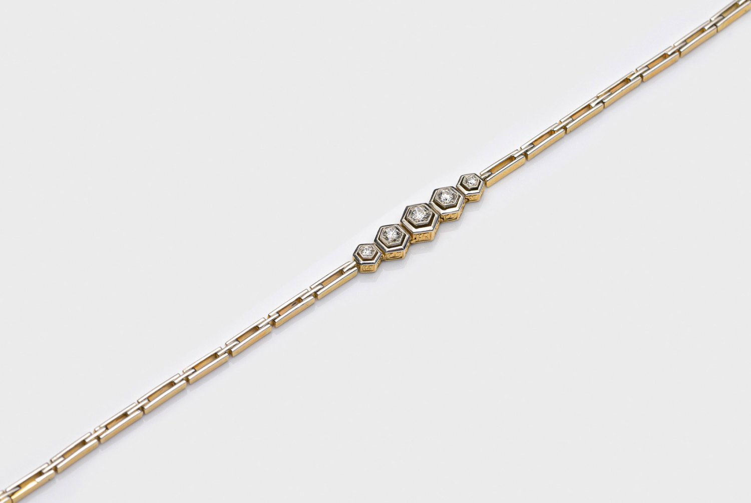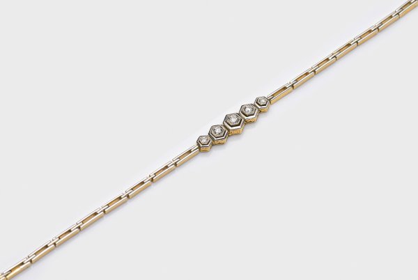 Gelbgold, gest. 585. Zentral besetzt mit 5 Diamanten im Altschliff, jeweils hexagonal eingefasst. Steckverschluss mit Sicherheitsöse. L. ca. 18 cm. Gew. ca. 10,78 g.