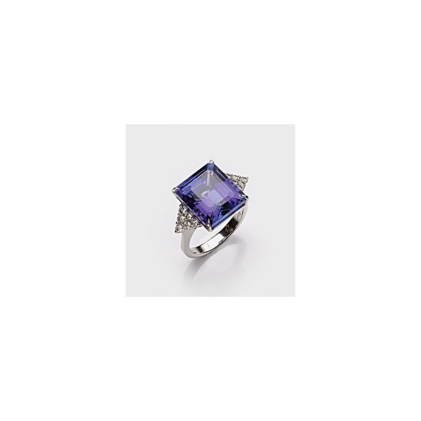 Weißgold, 18 ct.; Zentral besetzt mit einem violettblauem Tansanit von ca. 14,79 ct., flankiert von Brillanten von zus. 0,52 ct.; Gew. ca. 8,79 g.
