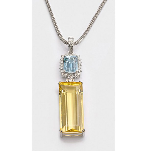 Weißgold, gest. 750. Schauseitig besetzt mit einem goldgelben Skapolith von ca. 33,42 ct. im Tafelschliff, bekrönt von einem himmelblauen Aquamarin von ca. 4,14 ct. im korrespondierenden Schliff, entouriert von Brillanten von zus. ca. 0,90 ct. (H/I-J/vs-si). Dazu Kette aus feinen Kugelgliedern. Ges.-Gew. ca. 24,46 g.