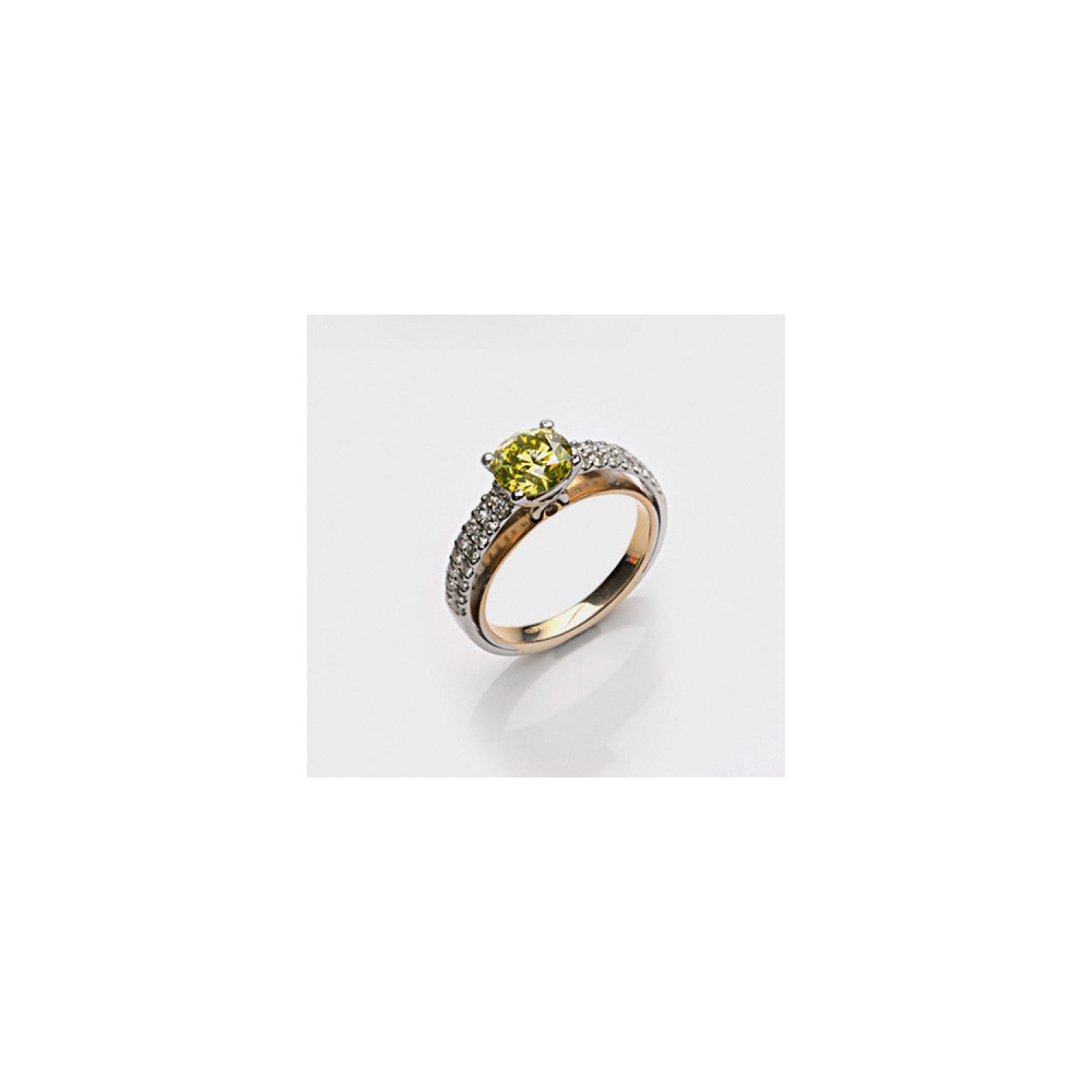 Weißgold, gest. 750. Zentral besetzt mit einem Fancy Vivid Yellow-Brillanten von ca. 1,55 ct. (vs2), flankiert von Brillanten von zus. ca. 0,65 ct. (F-G/if). Gew. ca. 5,25 g.