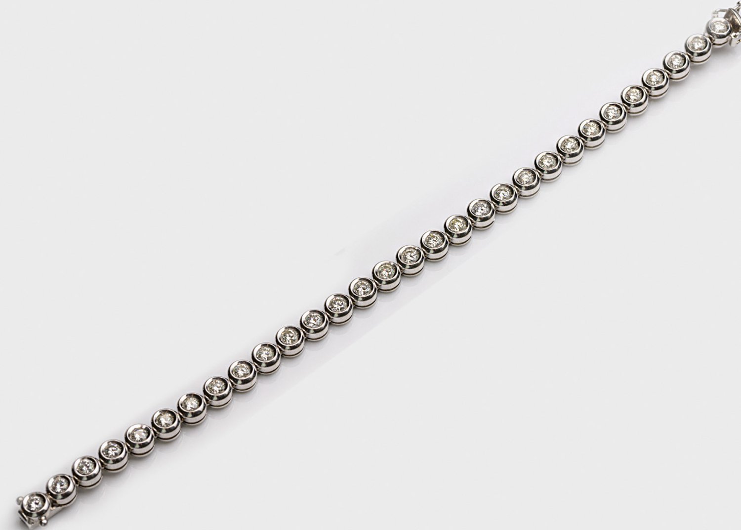 Weißgold, gest. 750. Schauseitig linear besetzt mit insg. 30 Brillanten von zus. ca. 4,00 ct. (I-J/si2-3/i1), jeweils rund eingefasst. Steckverschluss mit zwei Sicherheitsösen. L. 18,5 cm. Gew. ca. 23,58 g.