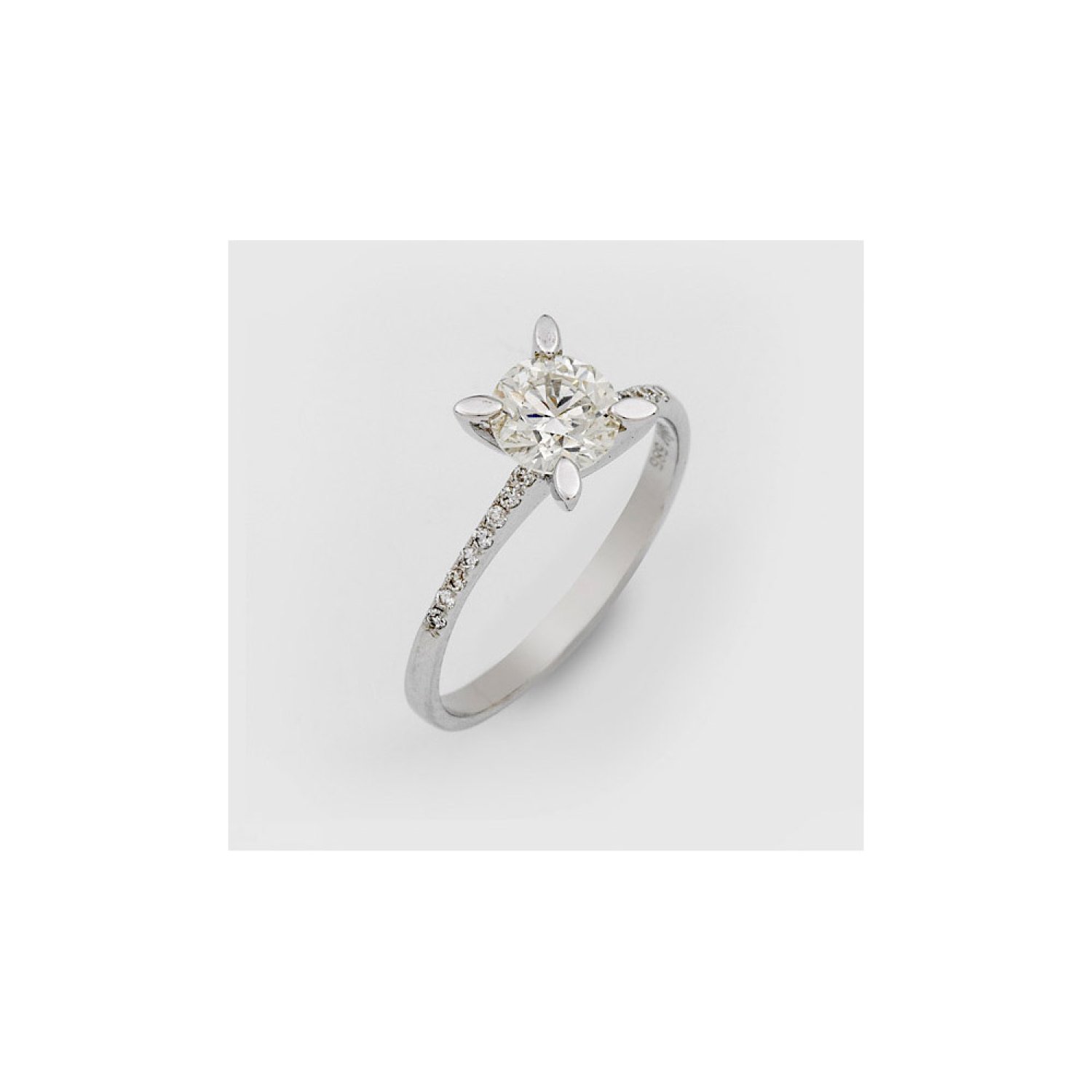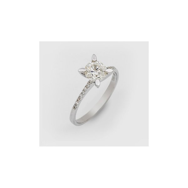 Ring set with a brilliant solitaires approx. 0,98 ct. (H/si1) and small brilliants approx. 0,12 ct., in 14 k. white gold. Certificate included.